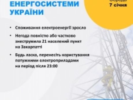 Через несприятливі погодні умови (сильний сніг, налипання мокрого снігу) – не ранок повністю або частково був знеструмлений 21 населений пункт у Закарпатській області. Також є знеструмлені через негоду споживачі на Київщині. В обох регіонах пошкоджені лінії відновлюють бригади місцевих обленерго.